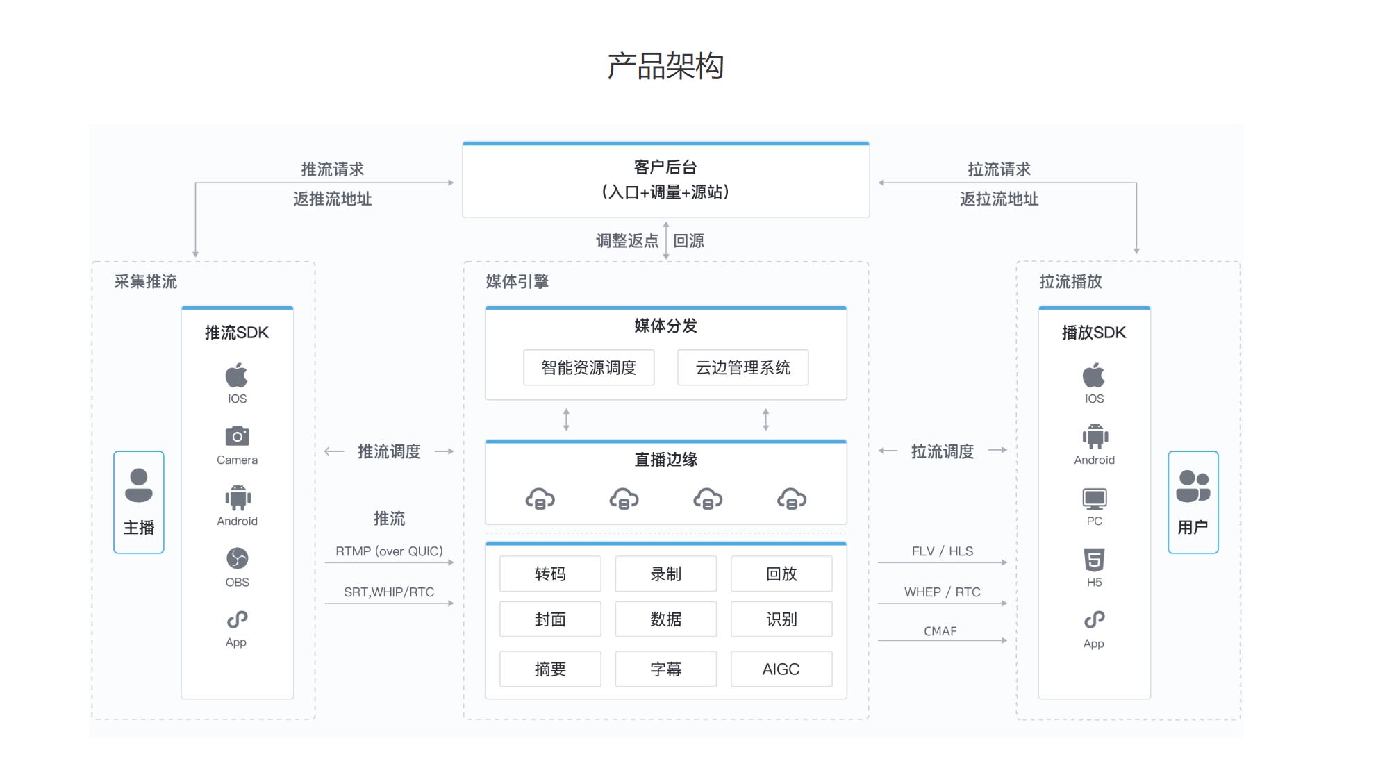 自主研发的推拉流技术,最低延迟降低到500ms,采用cdn分发技术,支持高并发,千万级并发不卡顿,支持rtmp、m3u8、flv、webrtc等多种拉流格式